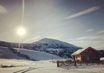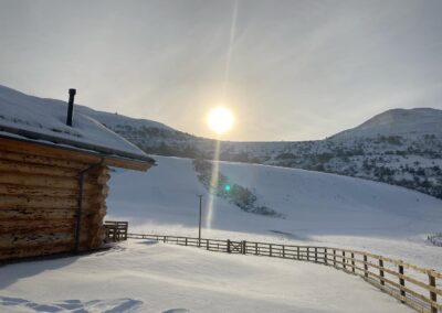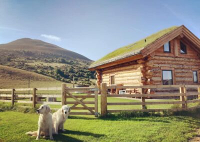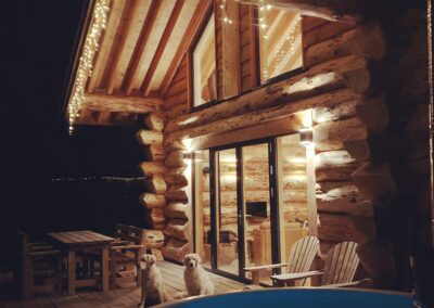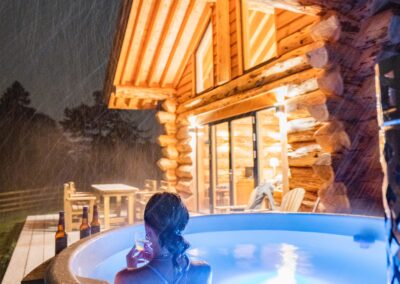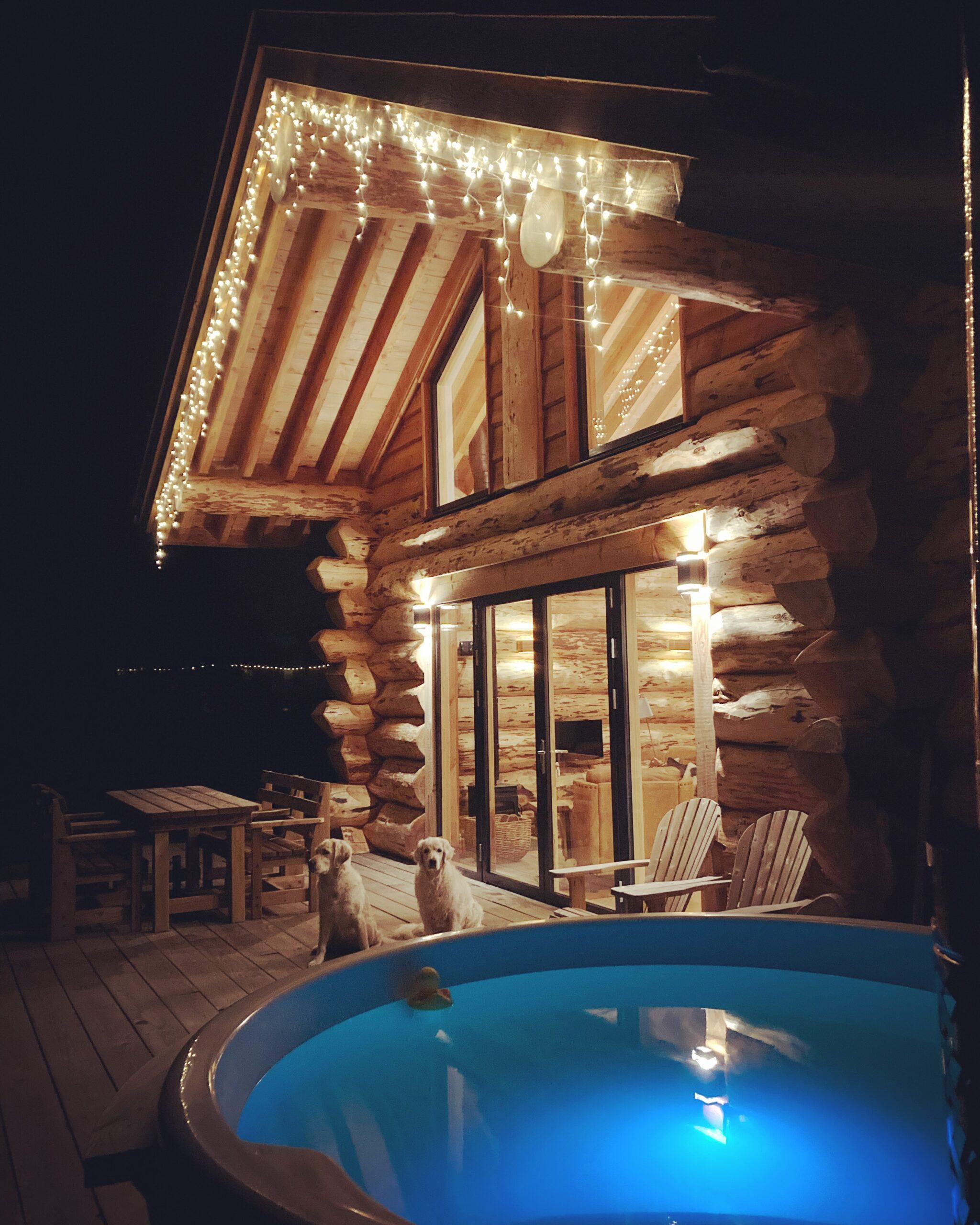 - Environment aware – The central heating is provided by our eco-friendly air source heat pump using electricity from renewable sources only. Firewood for the wood burning stove and hot tub comes from sustainable sources, currently our own woods. The grass turf roof minimises the visual impact on the landscape and helps local wildlife. The carbon footprint of the cabin build was kept to a minimum by using timber logs sourced from local trees and a local log builder.